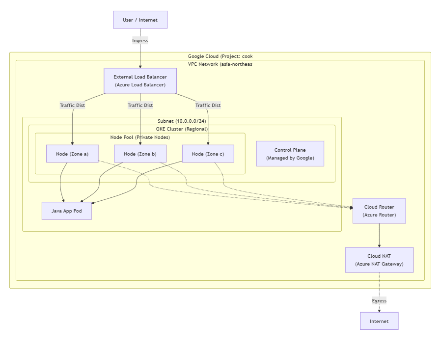 組織ポリシー(外部 IP 禁止)に準拠するため、GKE ノードはプライベート IP のみを持ち、外部への通信は Cloud NAT を経由します。